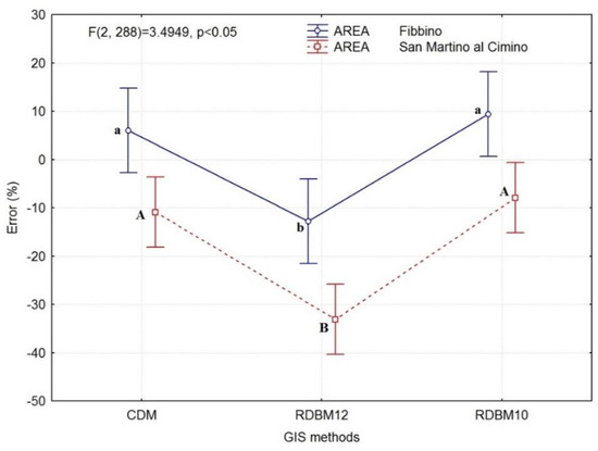The analysis showed that, for the two areas, the errors had the same trend. A further comparison of the GIS methods (Figure 11) showed that statistical difference was present only between the GIS method, RDBM12, compared to the other two. In particular, RDBM12 showed the highest error, ranging from −13% to −33%, an overestimation of the distances calculated by the specific GIS method. The RDBM10 method was particularly accurate in the Fibbino area, where an error of only 6% was obtained (an underestimation of the distances), while the CDM was particularly accurate in the San Martino al Cimino area, where an error of only −8% was obtained (an overestimation of the distances). Statistically, the two GIS methods, RDBM10 and CDM, showed errors for the Fibbino area grouped as an average error of 7.7%, showing an underestimation of the distances calculated by the specific GIS methods. The same GIS methods for the San Martino al Cimino area showed errors grouped as an average error of −9.4%, showing an overestimation of the distances calculated.