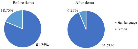 To measure the target audience preferences regarding human–robot interaction, a preliminary study is performed in this section to obtain the rate of users that prefer sign language over subtitles in this assistive robotics context, before and after watching a TEO humanoid robot demonstration. These preferences are asked and shown as it is important to measure the user interest regarding the use of sign language within the context of humanoid robotics, before engaging in deeper studies.