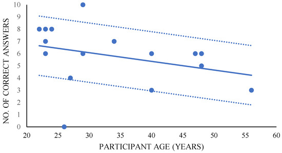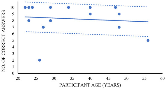 For this vocabulary test v, the resulting equation used to draw the trendline and the coefficient of determination are shown in Equations (10) and (11). As expected, the slope of the negative trendline is less than one third of the dactylology trendline slope, which means that the tendency to misunderstand sign language using words in relation to age is almost insignificant. Since the regression line is relatively far from a high percentage of the points, the of the regression is quite low.