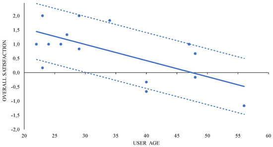 Graph of user satisfaction relation versus age (years) with linear trendline and linear regression channel which contains approximately 68% of all answers. A five level Likert scale has been used, where the values mean: (−2) Strongly disagree, (−1) Disagree, (0) Neither agree nor disagree, (1) Agree, (2) Strongly agree.