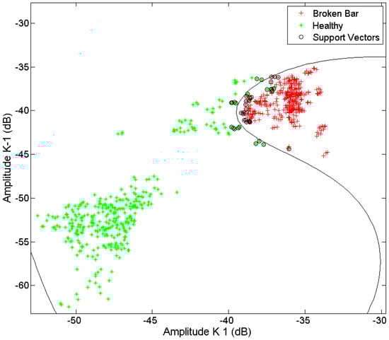 SVM is an expert system based on n-dimensional spaces where each n parameter of the feature corresponds to the n dimension of the space (n feature parameters = n dimensions of the space). The learning stage is based on the generation of a (n−1) hyperplane that divides the n-dimensional space into two subspaces where each one represents one solution of the problem, which is sufficient to discern the occurrence or absence of fault.
