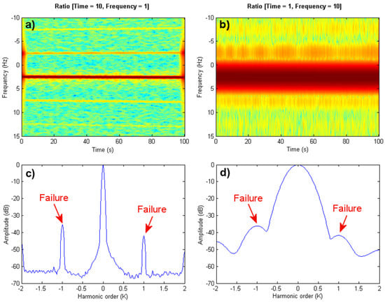 In HOTA method, as in the other methods that develop time/frequency spaces, it is essential to adjust the proportion of window filter to maximize the resolution of the space and the desired frequencies. Depending on the proportion applied to the Gaussian window filter, the space resolution can be improved (Figure 6a,c) or be worsened (Figure 6b,d), hindering the fault detection.