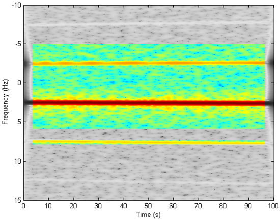 As discussed above, the t-f spectrum is generated with a STFT transform. Nevertheless, as explained in [6], a SFFT transform can be used instead STFT, obtaining the same t-f spectrum. It is remarkable that the use of the SFFT in diagnostic applications reduces greatly the required computational power, regarding the STFT. This is due to the fact that the fault frequencies to be analyzed are known and the SFFT is able to generate the t-f spectrum by moving the Gaussian window in the frequency domain within a limited range close to the desired frequencies. This can be seen in Figure 7, where the results of the SFFT are shown in color, whereas the gray zone shows the results of the t-f spectrogram as obtained with the traditional STFT.