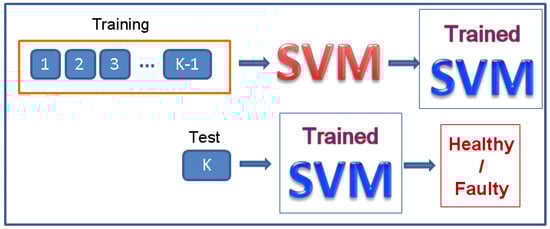 As described the scheme for the ‘leave one out cross validation’ (Figure 9), for each feature k, a trained SVM is generated with the remaining features, that is, excluding k feature. Once the SVM has been trained, then the k feature is validated. Repeating this process for the whole set of fault features, it yields finally an approximate hit ratio quite close to the actual hit ratio.