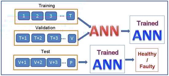 For ANN, the ‘leave one out cross validation’ method is not optimal to obtain a good approximation of the hit ratio, due to the operative of the algorithms used to train ANN expert systems. Accordingly, in this research, it has been implemented for training the ANN a ‘training/validation/test cross validation’ method. This method, shown in the scheme of Figure 10, iterates in a loop of 100 iterations (100 basic trainings) where the fault characteristics are distributed in each iteration between the training, validation, and test sets. Between 60 and 80 percent of features are assigned to the training set, between 10 and 20 percent features for the test set, and the rest is assigned to the validation set.
