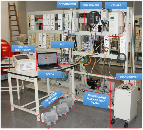 Figure 11 shows the test bed used in this paper. Two squirrel cage IMs whose main characteristics are given in Appendix A were tested, one in healthy conditions the other with a rotor broken bar fault. The broken bar fault was created by drilling a hole in one bar, in the junction of the bar with the end ring, as can be seen in Figure 12. This way to produce the bar breakage avoids damaging the magnetic circuit of the rotor and enables an easy verification of the complete disconnection between the bar and the end ring. To cover a wide scenario of industrial situation, the motor under test has been feed, alternatively, through variable speed drives (VSDs) of two different brands (ABB model ACS800 and Siemens model M440) with up to four different control strategies (scalar, scalar with slip compensation, field oriented control (FOC) and direct torque control (DTC)) and direct on-line (DOL) through an autotransformer. A permanent magnet synchronous machine (PMSM) is used as a mechanical load controlled by a drive ABB model ACSM1-04AS-024A-4. The test bed is controlled using a programmable logic controller (PLC) and a system control and data acquisition (SCADA) system which allows to perform the test in an automatic way and to repeat accurately the same conditions with different motors under test. A digital oscilloscope model Yokogawa DL750 has been used to acquire the currents during the different performed tests.