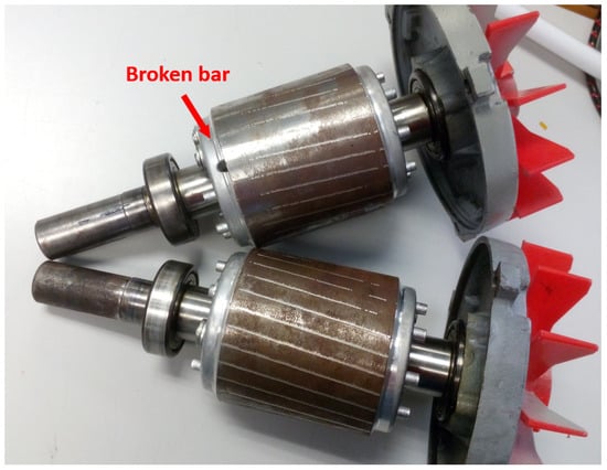 Top rotor with an artificially rotor broken bar fault and bottom rotor in healthy conditions.