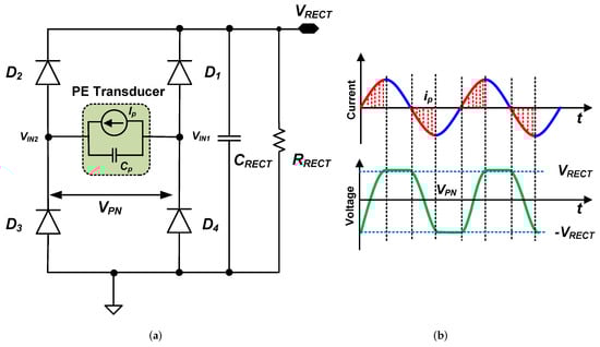 For further understanding of the proposed rectifier, we analyze the power extraction and conversion process of the conventional full bridge rectifier (FBR). The conventional FBR with ideal diodes , its current pulse , and waveform across the PE transducer i.e., is shown in Figure 2.