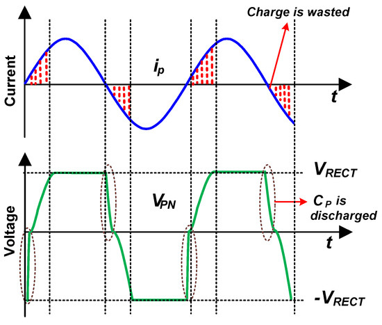 Figure 2 shows that available charge in the PE transducer is not completely delivered at the output [2]. The shaded portion shows that, at every half cycle, the amount of charge is not delivered at the output, and the current waveform from the PE transducer has to charge the capacitor from to before the diodes turns on. This losted charge limits the amount of power that can be extracted using the conventional FBR. The charge that actually flows into the output capacitor is just the difference between the total available charge and the lost charge [2]. The amount of charge available from the PE transducer is given as [12]