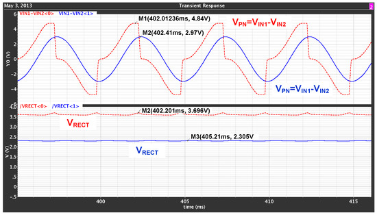 The proposed DS active rectifier shown in Figure 1 is implemented in 180-nm CMOS technology and is simulated and measured with the following transducer parameters, = 490 A, = 130 nF, = 200 Hz, and = 1 M. The values of load resistor and capacitor are 200 K and 1 F, respectively.