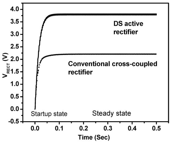 Comparison of transient voltage at the input and output of the proposed DS active rectifier and conventional cross-coupled rectifier.