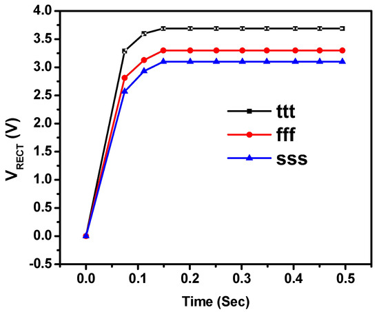 Figure 5 shows the rectified output voltage of the DS active rectifier and cross-coupled rectifier is 3.91 and 2.15 V, respectively. It starts from zero, when the PE-transducer is at rest. The output voltage increases when the traducer starts vibrating and reached at its steady state. The proposed DS rectifier is simulated at different corners (tt, ff, ss) as well as for the verification of the design functionality are shown in Figure 6. It is shown that the maximum rectified output voltage can be seen at ’tt’, while comparable rectified out voltage can be seen at ’ff’ and ’ss’. This is because at ‘ss’ the threshold voltages of NMOS/PMOS becomes low which results in a low rectified output voltage. The same will happen at ‘ff’ corner as NMOS/PMOS transistors threshold voltage becomes high [13]. The theoretical maximum output power of the proposed and conventional cross-coupled rectifier is 468 and 234 W, respectively, and the calculated power of proposed and cross-coupled rectifier is 427 and 189 W, respectively. The active area of the proposed DS active rectifier is 53 × 18 m and is shown in Figure 7. The efficiency of the proposed DS active rectifier is 91.5%. The performance summary of the proposed DS active rectifier and its comparison with other reported rectifiers is shown in Table 1. It is shown that the voltage and efficiency is the best when it is compared with the other reported designs in the literature [14,15,16,17,18,19]. The measured results of the proposed DS active rectifier are shown in Figure 8. For the measurement the PE transducer’s equivalent model circuit is used instead of the actual PE transducer. It consists of an AC voltage source in series with a capacitor is used. A sine wave of 200 Hz with 3-V pk-pk is placed in series with the = 130 nF. The measured waveform , the control signal VSW and the rectified output voltage is shown in Figure 8. The measured output voltage is 3.61 V while in simulation it is 3.91 V.