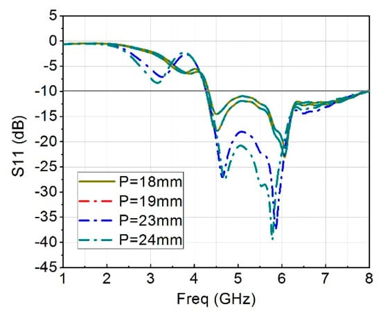 The parametric analysis is presented using different values of P from the geometry, to have best values that can give us a better performance of the antenna, in terms of its reflection coefficient. Figure 1 shows the S11 for various length of P, it clearly shows that when the value of P was 23 mm, the S11 was at 5.8 GHz, which is the required frequency band of interest. Though the remaining plots are also within the range of −10 dB.