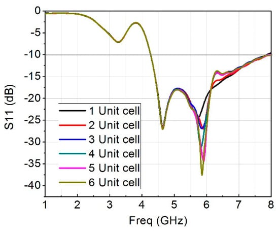 S11 plot for various quantity of metamaterial unit cell.