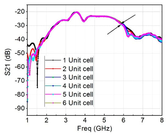 S21 plot for various quantity of metamaterial unit cell.