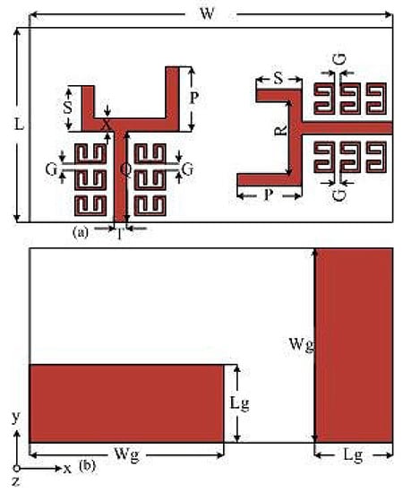 The increasing demand for higher data throughput and the need for more reliable connections has motivated the use of multiple antenna techniques, which is a key feature for increasing the performance of wireless communication systems. In order to improve high data rates and secrecy, multiple antennas can be applied with spatial multiplexing, moreover, channel capacity can be greatly increased without sacrificing the spectrum of frequency and transmit power [,,,]. Multiple-input-multiple output (MIMO) antennas should have multiple ports and it is expedient to have those ports isolated and well matched as no matching network is connected. Although, different applications will have different properties when it comes to design, the major challenge faced by many space-limited applications are the difficulties in implementation and the increasing commutation in spatial diversity []. Another challenge facing the design of MIMO antenna are the electromagnetic interactions among the array elements called mutual coupling []. When several antenna elements are placed close proximity to each other, the electric field generated by one antenna alters the current distribution on the other antennas, therefore, the radiation pattern and input impedance of each array element are distributed based on the presence of the other elements []. The effect of mutual coupling severely degrades how the MIMO system performs, due to that, all the antenna elements have to be considered together as one aperture. In order to reduce the space and mutual coupling between the antenna elements, researchers have used various methods including the use of defected ground structure s(DGS) [,], neutralization lines [] and electromagnetic band gap (EBG) structures [,]. Metamaterials have attracted much interest over the last few years, as they introduce interesting possibilities for how to improve antenna performance; they are used as a protective measure between two radiating elements to control and limit propagation among antenna elements and to lower the electromagnetic interactions among them [,,,]. Some interesting designs has been reported in the recent literature on the use of metamaterials to increase the isolation of an antenna. A letter presented in [] demonstrated the use of a split rectangular loop resonator inspired MIMO monopoles for a global system for mobile (GSM)/long-term evolution (LTE)/wireless local area network (WLAN) applications, where a long stub together with four metamaterial unit cells was used. The use of a complementary split ring resonator (CSRR) has been studied in [,] where the CSRR is used to lower the resonant frequency of the radiating element as well as to produce multiple resonance. The work in [] used a split ring resonator, which was placed between the two elements so as to increase the isolation characteristics higher than 15 dB over the band of interest.