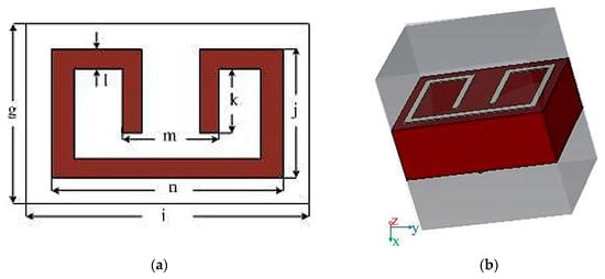 The geometry of the two element MIMO monopole is pictured in Figure 4a,b. The design was performed using computer simulation technology version 2017 (CST AG, Darmstadt, Germany). The MIMO antenna was mounted on an FR4 substrate with a relative permittivity of 4.3, a 0.025 loss tangent and height of 1.6 mm. the system consist of two printed patches on top separate by a distance of 0.29 (22 mm) (top view) and a ground plane (bottom view), where is the free space wavelength. The distance between the two antennas was not too wide and at the same time was not too close, which is why the decoupling structure was employed to reduce the interference. Two rows of split rectangular loop resonators were placed around the two antenna element. Each row contained six elements which is quite enough to give perfect inductance. The total design area was 40 × 80 mm2. Figure 5a,b shows a two-dimensional and 3D view of a metamaterial unit cell, which was etched on a 1.6 mm thick FR4 epoxy substrate with a dielectric constant of 4.3 at a frequency of 1–12 GHz. Both the parameters of Figure 4 and Figure 5 are pictured in Table 1 and Table 2. Figure 5b shows a unit cell dimension of 3 × 4.8 × 1.6 on xyz coordinates. The z-axis is the negative magnetic permeability for the boundary condition while the x-axis is a two opening where the port was inserted which propagates the wave, and finally the y-axis is perfectly electric. The electric permittivity retrieval was set using the S-parameter retrieval technique.