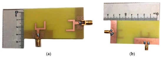 Fabricates antenna; top view (a), bottom view (b).