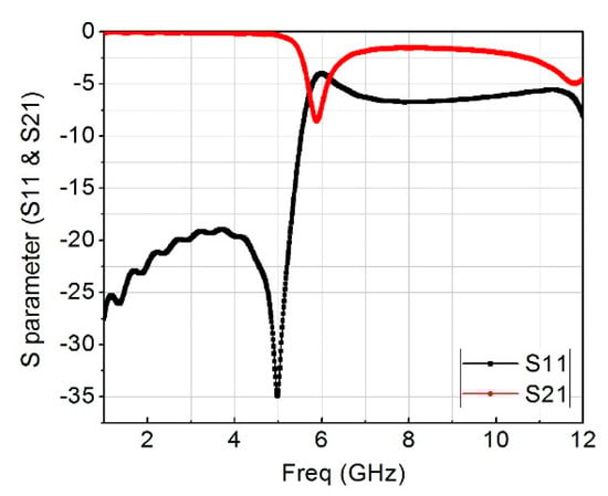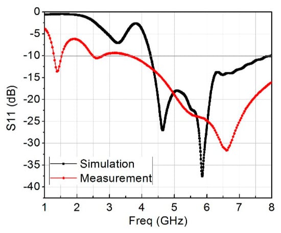 The remaining dimensions of the rectangular loop resonator are fixed except m, which is the gap capacitance that is controlled by the length of k, the value of k was chosen to be 1.75 mm after a series of optimizations because the resonant frequency changed correspondingly from 4−8 GHz. Figure 6a and Figure 3b show the top and bottom views of the constructed design containing the two-element of the MIMO antenna together with six-unit rectangular cells placed around them. Figure 7 presents the measured and simulated S11, and Figure 8 is the measured and simulated voltage standing wave ratio of the MIMO system. The measured and simulated isolation (S21) is pictured in Figure 9. The construction of the MIMO antenna and measurement were carried out at the Institute of Micro-nano Photoelectronic and Electromagnetic Technology Innovation School of Electronics and Information Engineering, Hebei University of Technology, China using N5244A network analyzer. The measured and simulated impedance width and voltage standing wave ratio (VSWR < 2−10 dB) of the design was 65.5%, ranging from 4.2 GHz to 8 GHz. The metamaterial unit cell permeability, real and imaginary parts, is shown in Figure 10 while Figure 11 is the MTM S11 and S21.
