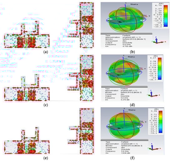 Modal surface current and modal 3D radiation pattern of 3 modes at 5.8 GHz; (a,b) mode 1, (c,d) mode 2, (e,f) mode 3.