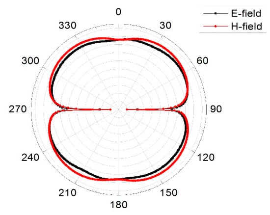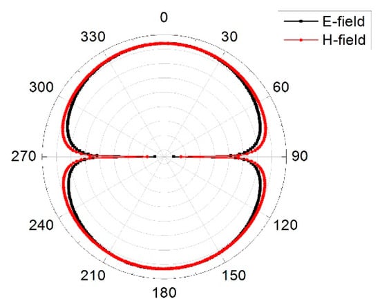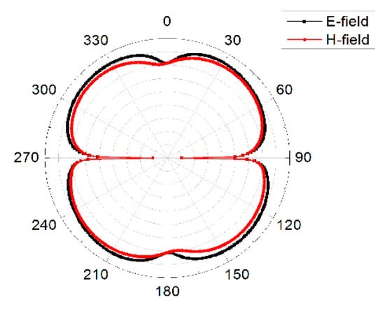 Equation (5) gives a better interpretation of how energy is stored in the MIMO array. When the characteristic angle is 180° the mode resonates, when it is less than 180° the mode stores magnetic energy and when it is greater than 180° the mode stores electric energy. From Figure 13, mode 1 was almost at 5.8 GHz and remained the resonance frequency of interest. Figure 14 presents the modal surface current and modal 3D radiation pattern of different modes at 5.8 GHz. We can see that mode 1, being the dominant mode, had more gain as compared to the others which means mode 1 was also playing a significant role in terms of reducing the mutual coupling of the MIMO antenna. Figure 15 present the eigenvalue for the three modes at the resonant frequency. From the results it was clearly shown that the three modes were resonant with = 0 but mode 1 was more dominant. Figure 16, Figure 17 and Figure 18 are the normalized 2D radiation patterns at 5.8 GHz for modes 1, 2 and 3. The pattern shows the E and H planes for the antenna element at 5.8 GHz.