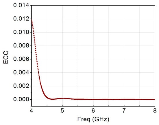 To verify the capability of MIMO antenna, it is important to have a low envelope correlation coefficient and a diversity gain of nearly 10 dB. The ECC are computed using the far field radiation pattern as calculated in Equation (6) []: