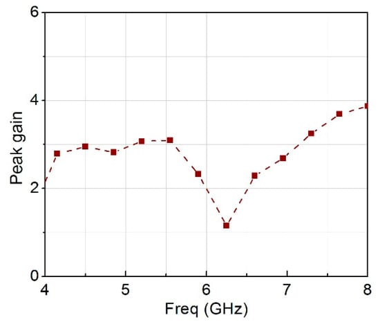 Figure 19 shows the ECC of the MIMO antenna with less than 0.002 over the entire frequency range. Figure 20 shows the diversity gain of nearly 10 dB. While Figure 21 is the peak gain over the entire frequency range.