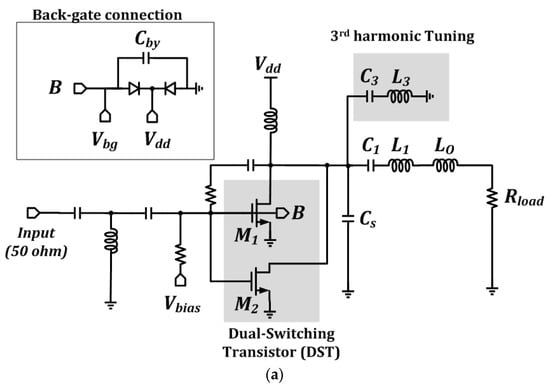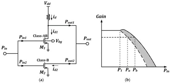 Figure 1a,b show the operation principle and the input/output characteristics of the DST structure, respectively. The structure consists of two switching transistors: (1) the primary switching transistor M1 biased at class-AB and (2) the secondary switching transistor M2 biased at class-B, which are connected in parallel. Only single input and output matching circuits were employed, thus providing less complexity for the single chip implementation. To realize the class-AB operation of M1, the positive back-gate voltage Vbg was injected. Hence, the threshold voltage decreased so that the overdrive voltage of M1 would be sufficient for the class-AB operation.