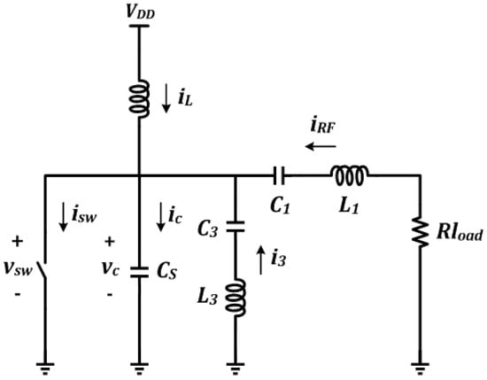 The third harmonic tuning technique shapes the voltage and current waveforms of the switching transistor at the drain node to minimize the dc power dissipation []. The technique is realized by connecting a series C3–L3 resonated at 3fo to the output node of the conventional class-E amplifier, as shown in Figure 2. Due to the resonator C3–L3, under specified conditions, the third harmonic component of the drain voltage and current waveforms can be controlled.