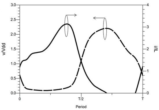 The normalized switching waveforms of drain current isw(ωt) for 0≤ ωt < π and drain voltage vc(ωt) for π ≤ ωt <2π are given by using Equations (4), (7), and (16) and the ratio of IL/IRF and IL/I3 as follows: