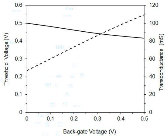 Simulated threshold voltage and transconductance versus back-gate voltage variations of the M1 at 0.5-V bias voltage.