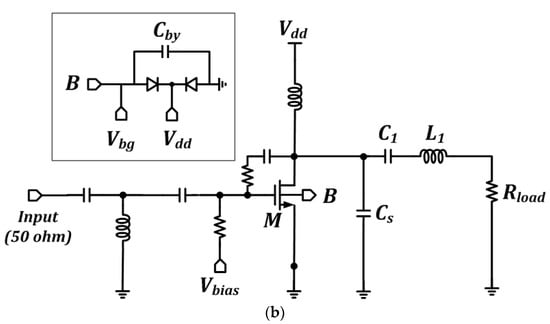 Figure 5a shows the circuit schematic of the proposed CMOS PA IC. To achieve high PAE at a low supply voltage, a combination of the DST and the third harmonic tuning circuit (C3–L3) is proposed. The supply voltage Vdd of 1 V was applied with the bias voltage Vbias of 0.5 V. In addition, a 0.5-V positive body bias was injected into the body terminal (B) of M1 by the external biasing terminal (Vbg) to decrease the threshold voltage level of 75 mV, which was optimum for the class-AB operation when there was no input power. In addition, the body of M2 was connected to the ground for the class-B operation. The RC feedback network was employed to modify the input and the output resistance for the impedance matching requirement, as well as to increase the stability of the device; hence, the PA was always unconditionally stable.