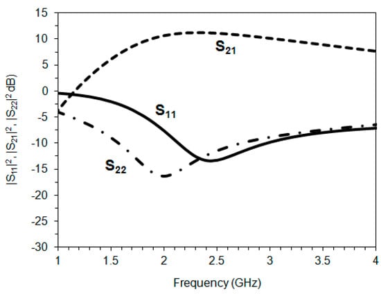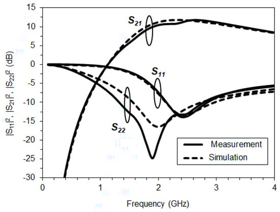 In order to demonstrate the small-signal performance based on S-parameters, the output RF was measured using the Agilent E8361A vector network analyzer. Figure 12 illustrates the comparison between the measured small-signal S-parameters (solid line) and the simulated small-signal S-parameters (dashed line) of the proposed circuits at 1 V of supply voltage. The quiescent current was 14.31 mA at 0.5 V of gate bias voltage. As expected, the measured S11 and S22 at 2.5 GHz were lower than −10 dB. The maximum small signal gain was 11.0 dB at 2.5 GHz with a 3-dB bandwidth from 1.7 GHz to 4.1 GHz. Figure 12 shows that measurement results agree well with the simulation results.