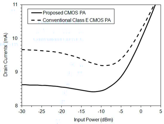Because the third harmonic tuning technique was very effective to decrease the dc power consumption, it is expected that the proposed CMOS PA has high efficiency. Figure 7 shows the simulated dc drain current of the proposed PA IC (solid line) and the conventional PA IC (dotted line) versus the input power. The proposed CMOS PA exhibited a lower dc current than the conventional one under small-signal conditions.