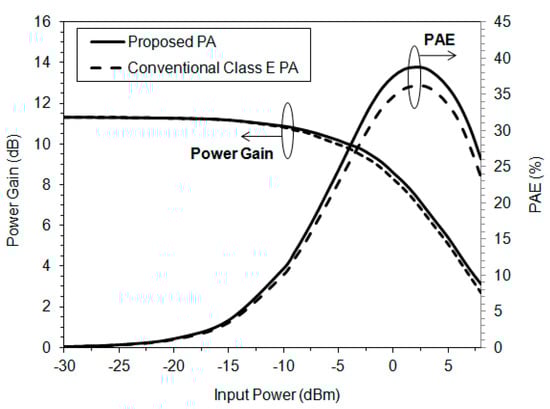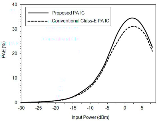 Figure 8 shows the simulated input–output response of the proposed and conventional class-E PAs with sweeping the input power. It confirmed that the proposed PA IC achieves better gain linearity with better PAE than the conventional class-E PA IC. At an input power of lower than -10 dBm, M2 was turned off and the input signal was mainly amplified by M1. When the input power increased, the output power of M2 became higher to compensate for the gain compression of M1, achieving a higher linear performance. From the simulation, it was shown that the proposed PA had a power gain of 11.5 dB, an output P1dB of 8.1 dBm, and a peak PAE of 38.5%.
