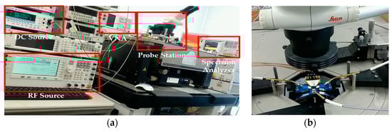 (a) Measurement setup; and (b) probing situation of the proposed CMOS PA IC.