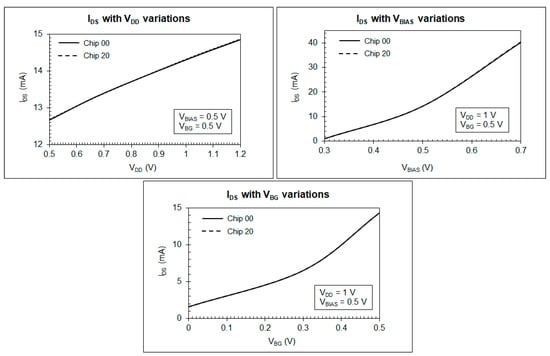 In the measurement process, 5 chips were measured for whole data variations, i.e., dc, small-signal, and large-signal performances. The average of the standard deviation of the IDS measurement was 0.03 mA, and the averages of the standard deviations of S11, S21, and S22 were 0.05 dB, 0.06 dB, and 0.1 dB, respectively. To demonstrate the uniformity performance of the PA chips, the IDS characteristics of chip 00 and chip 20 over the supply voltage (Vdd), bias voltage (Vbias), and back-gate voltage (Vbg) variations are illustrated in Figure 11.