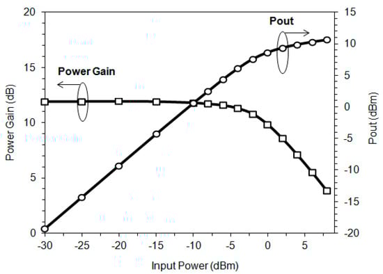 Measurement results of the power gain and pout of the proposed PA IC versus the input power.