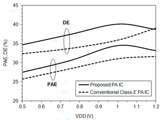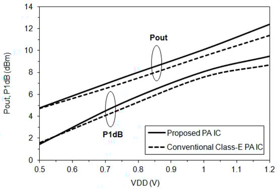 Figure 15 shows the measurement results of the output power and the P1dB of the proposed PA (solid line) and the conventional class-E PA (dotted line) versus the supply voltage variations from 0.5 V to 1.2 V. The proposed PA achieved larger saturated output power and P1dB than did the conventional PA. The dependency of the efficiency performances (drain efficiency (DE) and PAE) on the supply voltage is illustrated in Figure 16. The proposed PA achieved higher efficiency than the conventional PA at low-voltage operation. Because the load line was adjusted to obtain high efficiency at a supply voltage of 1 V, the efficiency at 1.2 V was slightly lower than that at 1 V.