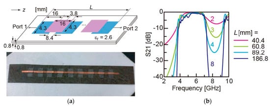Next, the transmission line with the two-dimensionally arranged structure is a structure in which the upper layer parasitic resonator is arranged at the center of the four resonators on the resonator array layer lined with the ground plate as shown in Figure 3 [,,]. The transmission loss is suppressed by optimizing the dimension of the upper layer parasitic element resonator, and the frequency to be used in the dimension of the lower layer resonator is determined. Although the microstrip resonance length is designed with reference to a half wavelength (/2), as the overlapping area of the lower layer resonator and the parasitic element as viewed from above is wider, the coupling strength is stronger and the transmission loss decreases. Consequently, the distance between adjacent resonators is optimized as a parameter. Also, in order to suppress the occurrence of higher order modes, we have a symmetrical structure.