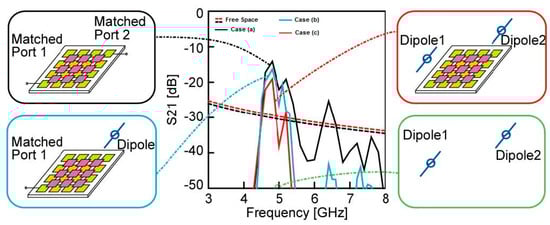 Figure 4 shows the transmission characteristics when the lower layer resonator designed at 5 GHz is 4 × 4 elements, obtained by simulation using the moment method. In order to clarify the transmission line characteristics, the following is considered: