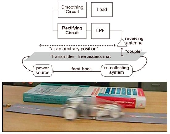 In order to efficiently perform power transmission, a patch antenna is used as a power receiving antenna and a full-wave rectifying circuit is incorporated as a rectenna. Although the electric field component in the vicinity of the line is mainly an electric field component parallel to the line, a circularly polarized wave element is used for the power receiving antenna so as to correspond to an arbitrary polarization plane. At this time, the coupling to the rectenna is greatly improved compared with −5 dB compared with the dipole. In the configuration of Figure 6 in which the rectifying circuit is connected to this patch antenna, at the input power of 40 dBm at 2.4 GHz, the output voltage becomes 5.1 V with respect to the load resistance of 3.8 Ω of the motor, and the power transmission efficiency in this system is about 70%. Further improvement in efficiency can be expected by optimizing the rectenna parameters. As described above, it was shown that power transmission by one-dimensional sheet-like transmission line is possible. It is to be noted that electric power transmission using a two-dimensional sheet can be realized in the same manner. In this manner, a method using a sheet-like transmission line that can be used only for devices that are closely coupled is effective. An example of this is in applications such as being able to charge from the access area while riding in an electric car. It is possible to achieve this when transmission line is laid on the road. It is also possible to charge the battery while parking without interfering with the next car by laying mats one by one on the floor of the parking lot.