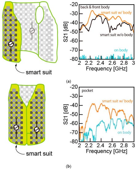 Figure 8 shows the transmission characteristics when the flexible transmission line is bent. Degradation of transmission characteristics due to bending hardly occurs. Next, a vest-like waveguide that can be worn on a human body is created using this flexible transmission line. As shown in Figure 9, the ground plate and upper- and lower-layer resonators are formed by conductive cloth, and a vest is created with a structure sandwiched between foams. By using this waist cover, it is possible to efficiently perform inter-device communication such as sensors installed near the human body. In particular, when a wireless device is placed in front of and behind the human body, it is difficult to maintain a communication line because the human body exists as a medium with a large loss, but by using this vest (called a smart suit). This situation can be improved. Figure 10 shows the transmission characteristics between the half-wave dipoles placed in front of and behind the human body via the smart suit and the transmission characteristics when both of the two dipoles are arranged on the entire human body. As shown in Figure 10a, when a half wavelength dipole is arranged in front of and back of the human body, the S21 characteristic has a transmission characteristic of about −70dB or less, which is about a noise level. Also, the transmission characteristics when a suit is worn on the human body, and the effectiveness of the smart suit are shown. When the smart suit is worn on the back and front of the human body, then the S21 characteristics have transmission characteristics of about −25dB up to −55dB. This means that the smart suit improves the loss by 45 dB or more as compared with the case when only the antenna is placed on the human body. Figure 10b shows transmission characteristics when the transmitting/receiving antenna is placed on the entire surface of the human body. However, even in this case, the transmission loss is improved by 20 dB or more when a smart suit is used, and its effect is obvious.