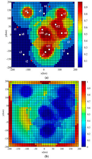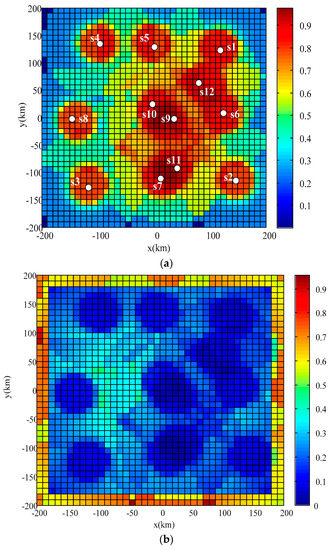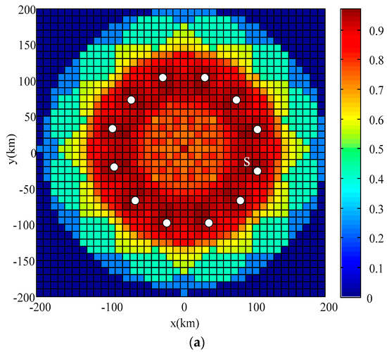 Before the sensor network is optimized, sensors in the networks are ordered as shown in Figure 5a. It can be found that in Figure 5a, 12 sensors are uniformly distributed in a 100 km radius circle. During each scanning period, the radiation time and radiation power are and , respectively. The target detecting probability in is distributed as shown in Figure 5a, and the target detecting risk in is distributed as shown in Figure 5b. Before optimization, the average target detecting risk of is 0.2922.