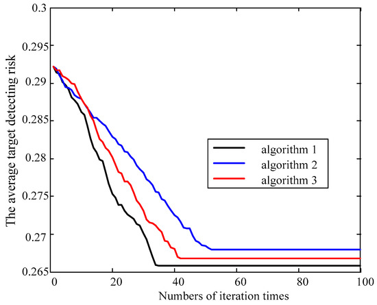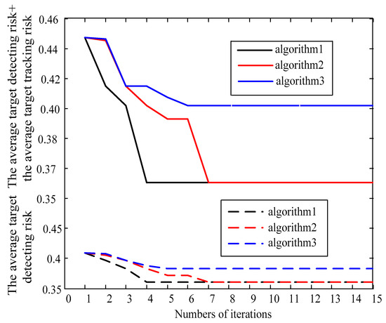 From Figure 11, when , sensors are scheduled in obedience with the minimum target detecting risk rule, and in this case, the target detecting risk is the minimum, but the target tracking risk is not the most optimal. When , sensors are scheduled in obedience with the rule of the minimum target tracking risk, and in this case, the target tracking risk is minimal, but the target detecting risk is not the most optimal. When , sensors are scheduled in obedience with the minimum total risk rule (the sum of the target detecting risk and the target tracking risk), and the target tracking risk and the target detecting risk are taken into account at the same time.