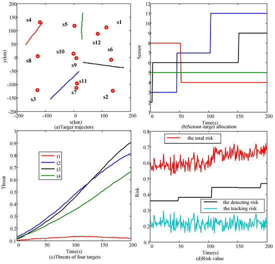 In a time period , the sensor scheduling schemes vary as shown in Figure 10. Figure 10a–d show the target trajectories, sensor–target allocations, target threat priorities, and risks in the mentioned time period of , respectively.