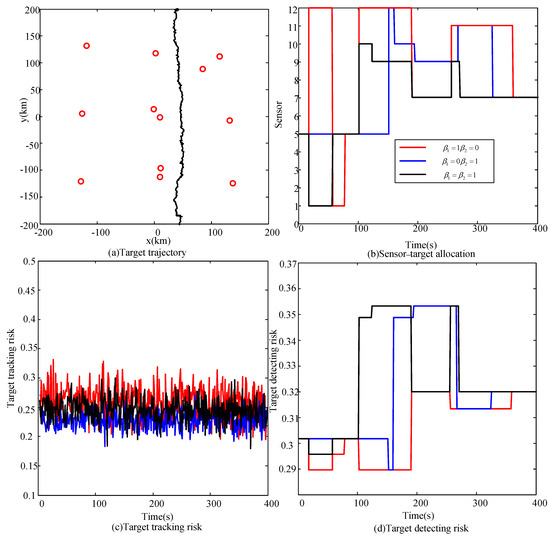 Figure 11a–d show the target trajectory, sensor–target allocations, target tracking risks, and target detecting risks in the time period of , respectively.