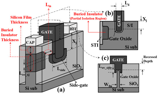 The partial isolation type S-FinFET (Pi-FinFET) is a structure with a buried insulator at a certain depth from the storage node of a conventional S-FinFET. Figure 1a shows a 3D schematic of a Pi-FinFET. Silicon film thickness, buried insulator thickness, and Lin, as shown in Figure 1a,b, are defined as the distance from the contact surface of the storage node to the buried insulator, the thickness of the buried insulator in the direction perpendicular to the channel, and the distance from the side gate oxide to the buried insulator, respectively. Lg, Lside, Lov_xj, and Lov_side represent gate channel length, the length of the side-gate in the direction parallel to the channel, the overlapped length of the side-gate and S/D doping region shown in Figure 1a, and the side-channel width shown in Figure 1c, respectively. When Lside and Lov_xj are increased, the width of the overlap region of the gate and the S/D region will also increase. The n+ poly gate with a gate work function of 4.2 eV was applied. Lg, Lside, Lov_side and the recessed depth are 30 nm, 42 nm, 10 nm, and 100 nm, respectively. RFinFET is the modified S-FinFET with a structure in which the overlap region between the side-gate and the S/D region is removed [5]. Therefore, the Pi-FinFETs proposed in this paper can be divided into Pi-SFinFET and Pi-RFinFET depending on the presence or absence of the overlap region between the side-gate and the S/D region. Namely, in this paper, the Lov_xj of Pi-RFinFET is 0 nm and that of Pi-SFinFET is 70 nm.