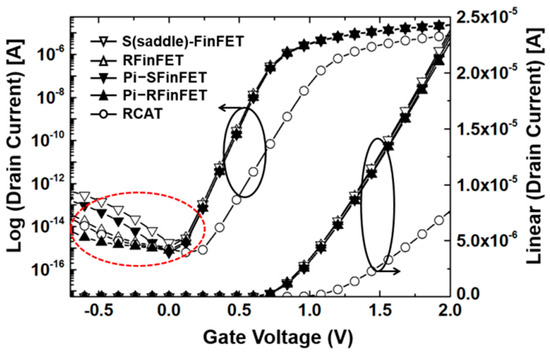Log and linear ID-VGS curves shown in Figure 2 are the result of comparing conventional S-FinFETs and RCAT with the Pi-FinFETs proposed in this paper. Silicon film thickness, buried insulator thickness, and Lin of Pi-FinFET was set at 20 nm, 100 nm, and 20 nm, respectively. As shown in Figure 2, the four saddle type FinFETs have significantly higher Ion than RCAT. Moreover, the dotted red ellipse in Figure 2 show that Pi-SFinFET has about three times smaller Ioff than S-FinFET, while Pi-RFinFET has about four times smaller Ioff than RFinFET at VGS of −0.5 V. To understand physical characteristics of Ioff reduction for Pi-FinFET, device simulations have been performed using the TCAD tool [9,10]. The 3-D simulator is well tuned to predict the leakage current such as GIDL by applying the Hurkx band-to-band tunneling model.