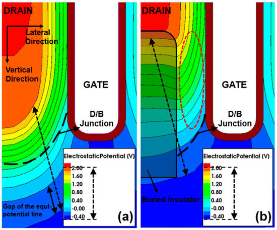Figure 3 shows the simulated potential contour near the drain region of conventional S-FinFET and Pi-FinFET at VDS of 1.5 V and VGS of −0.5 V. We defined the gap of equipotential lines as the potential drop width (PDW). In particular, dotted arrows in Figure 3a,b indicate PDW from 1.8 V to −0.4 V. As shown in Figure 3a, the conventional S-FinFET has intensive and narrow PDW from 1.8 V to −0.4 V near the drain/body (D/B) junction. On the other hand, PDW is mostly limited by the buried insulator of Pi-FinFET, as shown in Figure 3b. Namely, the rather constant electric field in the buried insulator of Pi-FinFET induces a wider PDW near the drain region [12]. The dotted red ellipse in Figure 3b shows that the PDW is wider in the silicon layer compared to the conventional S-FinFET. In other words, Pi-FinFET can reduce the electric field affecting GIDL in the silicon layer between the gate and drain regions. Moreover, the penetration of the electric field from the drain to the source affecting drain-induced barrier lowering (DIBL) is minimized in Pi-FinFET.